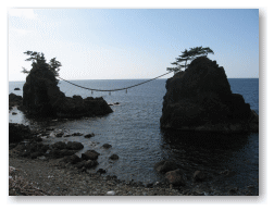 | 大きい岩と小さい岩の間がしめ縄で結ばれています。大きい方の岩の上には、何か祭られているか?祠があります。 |