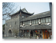 河には、屋形船が行き来しています。やっぱり中国風の屋形。寒山寺正面入口を見て左手には、昔風の商店街が続いています。